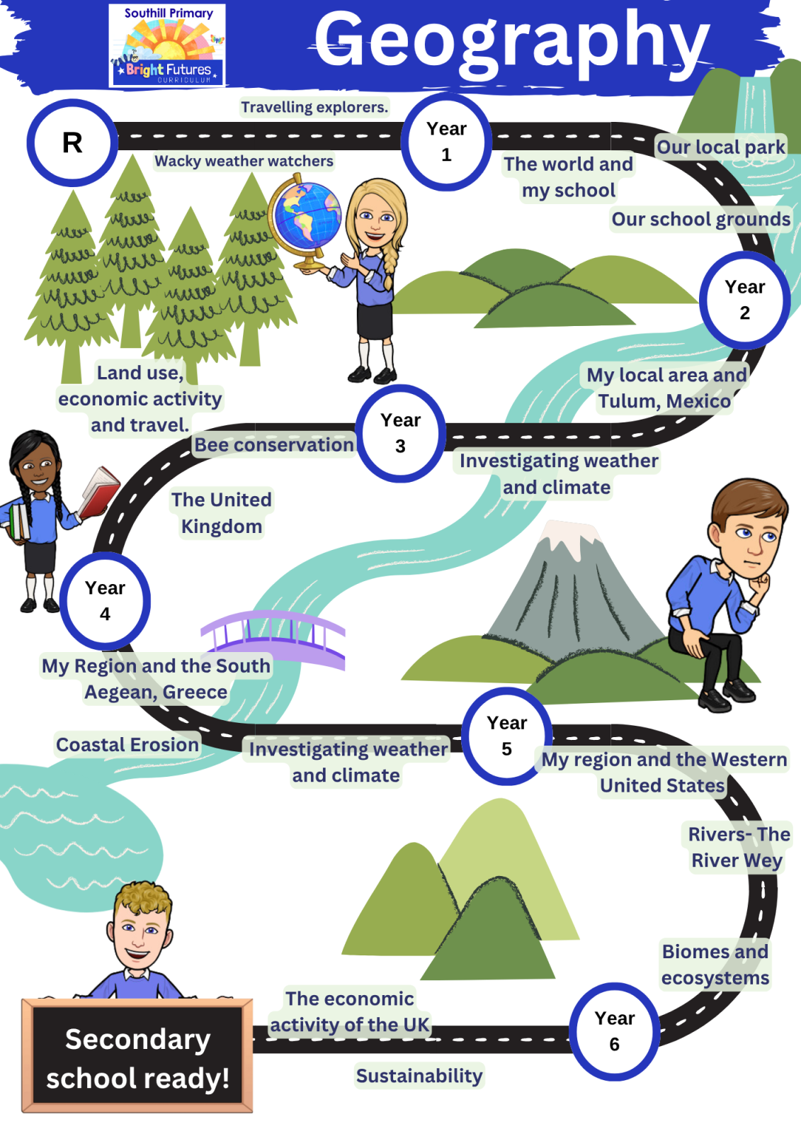 Geography at Southill is carefully planned to ensure that children can achieve depth in their learning. Teachers have identified the key knowledge and skills of each blocked topic and consideration has been given to ensure progression across topics throughout each year group across the school. Consideration is given to how greater depth will be taught, learnt and demonstrated within each lesson, as well as how learners will be supported in line with the school’s commitment to inclusion.
