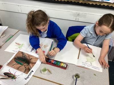 This week in art the children have continued exploring materials and techniques, refining lines, shading and expression as well as studying famous scientific artists. The children used a layering technique to build up their beetle picture and add depth as well as adding texture by shading and dotting their work.