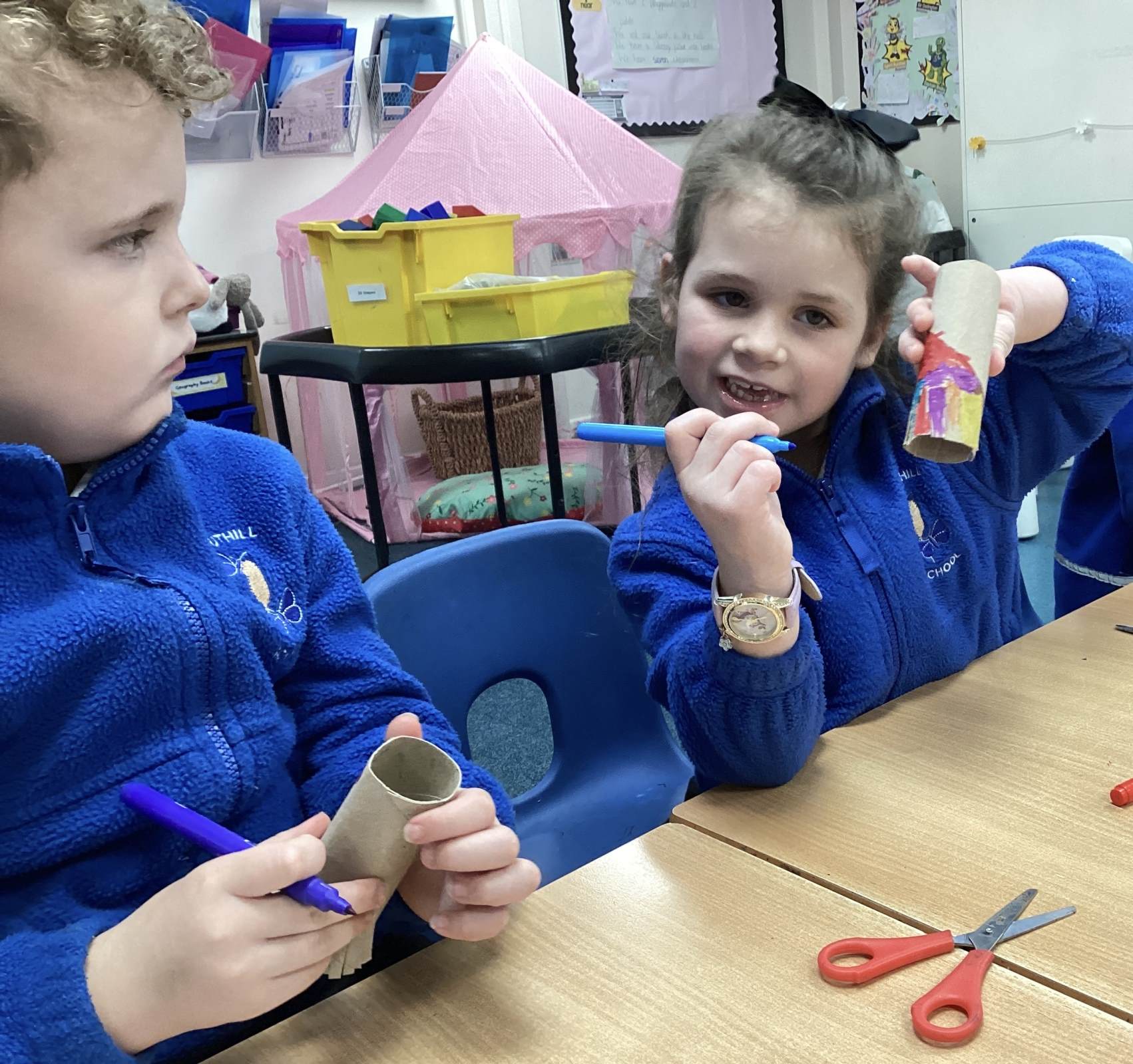 We began our morning by diving into our new book, Leo and the Octopus. The children love learning about octopuses! They got hands-on and made their very own octopuses using toilet rolls. Each octopus came complete with a special tag where the children wrote an interesting octopus fact. Did you know they have three hearts and that they use their arms to taste and touch?!