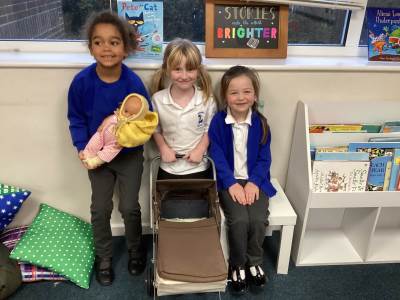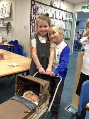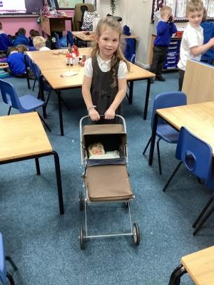 • An old pram and baby dolls