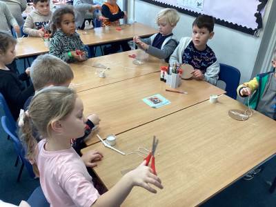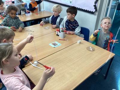 In maths, we’ve been exploring 2D and 3D shapes by making all sorts of patterns and talking about what makes shapes the same or different. The children have been practising naming the shapes, spotting them in repeating patterns, and using them to make their own patterns!