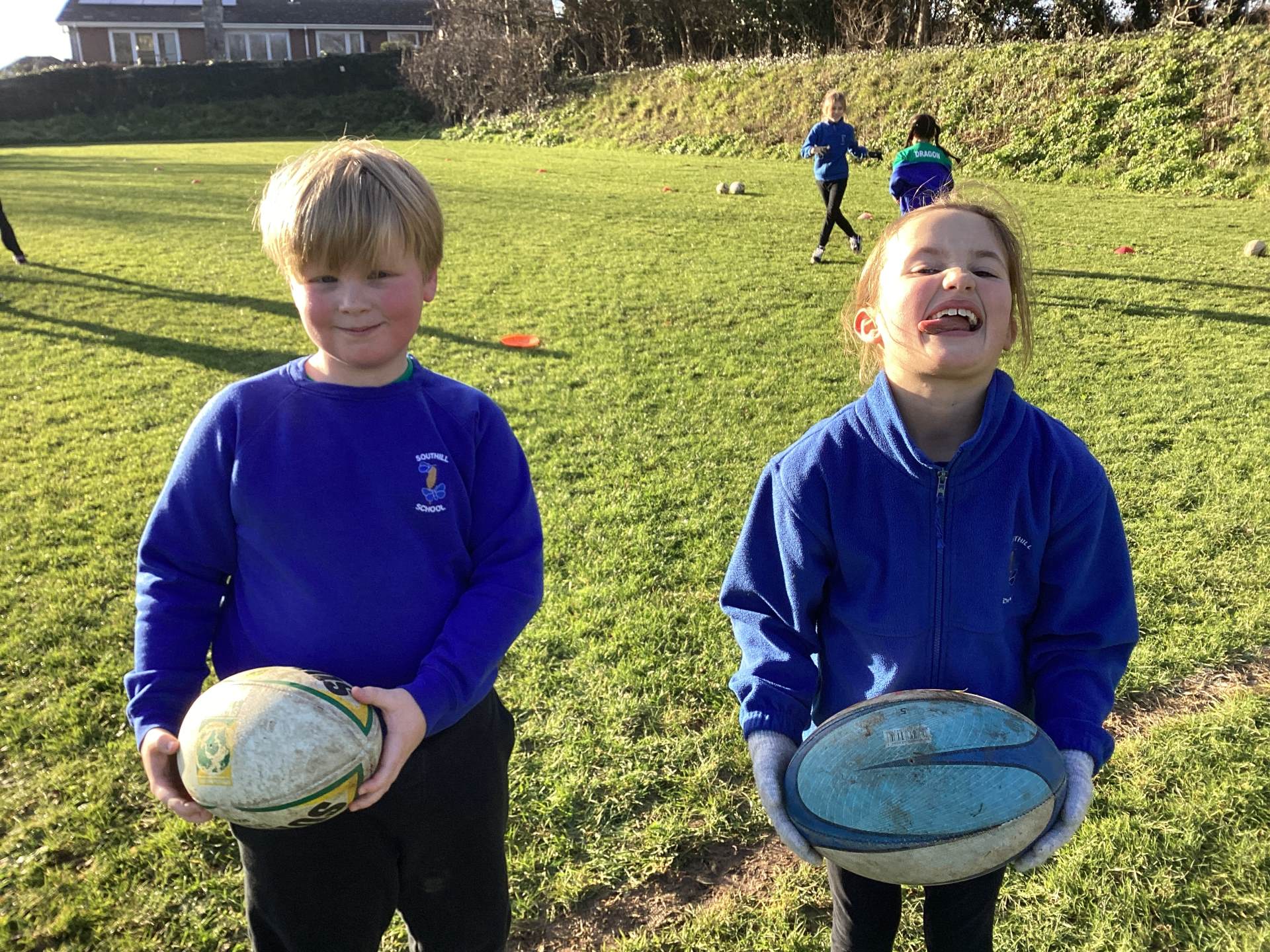 We began by getting to know the rugby ball. The children quickly noticed its unusual shape and learned that keeping it off the ground is very important. During the warm up the children ran around the area, scoring a try when “try” was called and throwing the ball into the air and catching it when “up” was shouted.