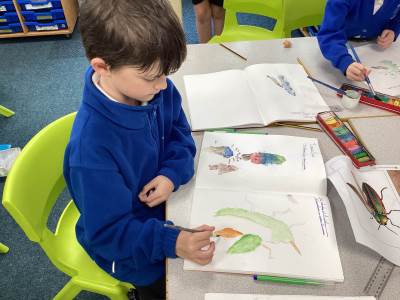 This week in art the children have continued exploring materials and techniques, refining lines, shading and expression as well as studying famous scientific artists. The children used a layering technique to build up their beetle picture and add depth as well as adding texture by shading and dotting their work.