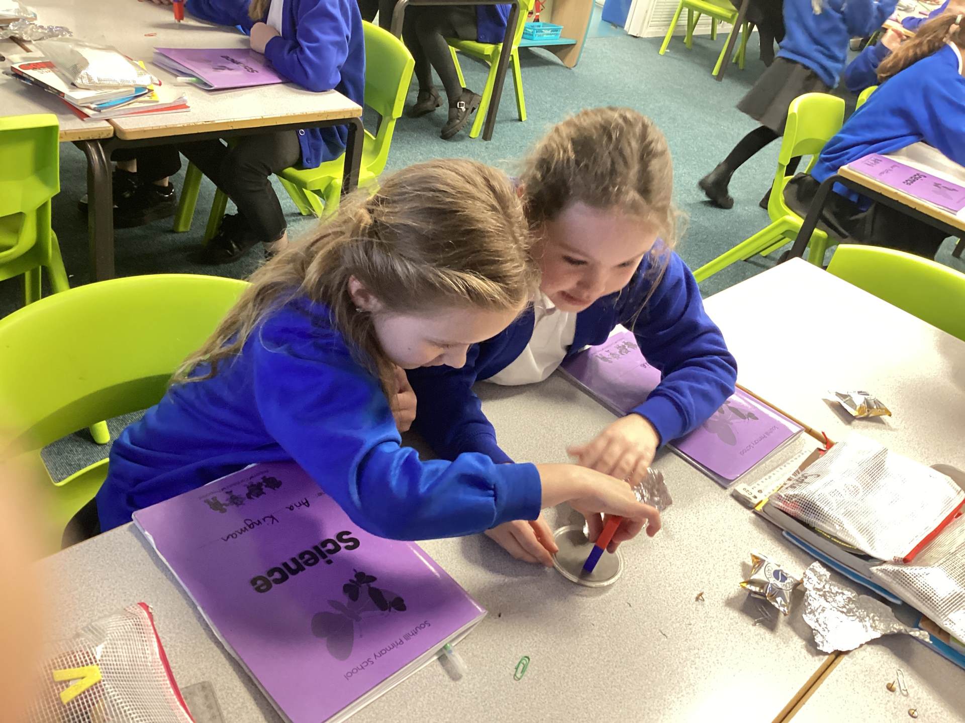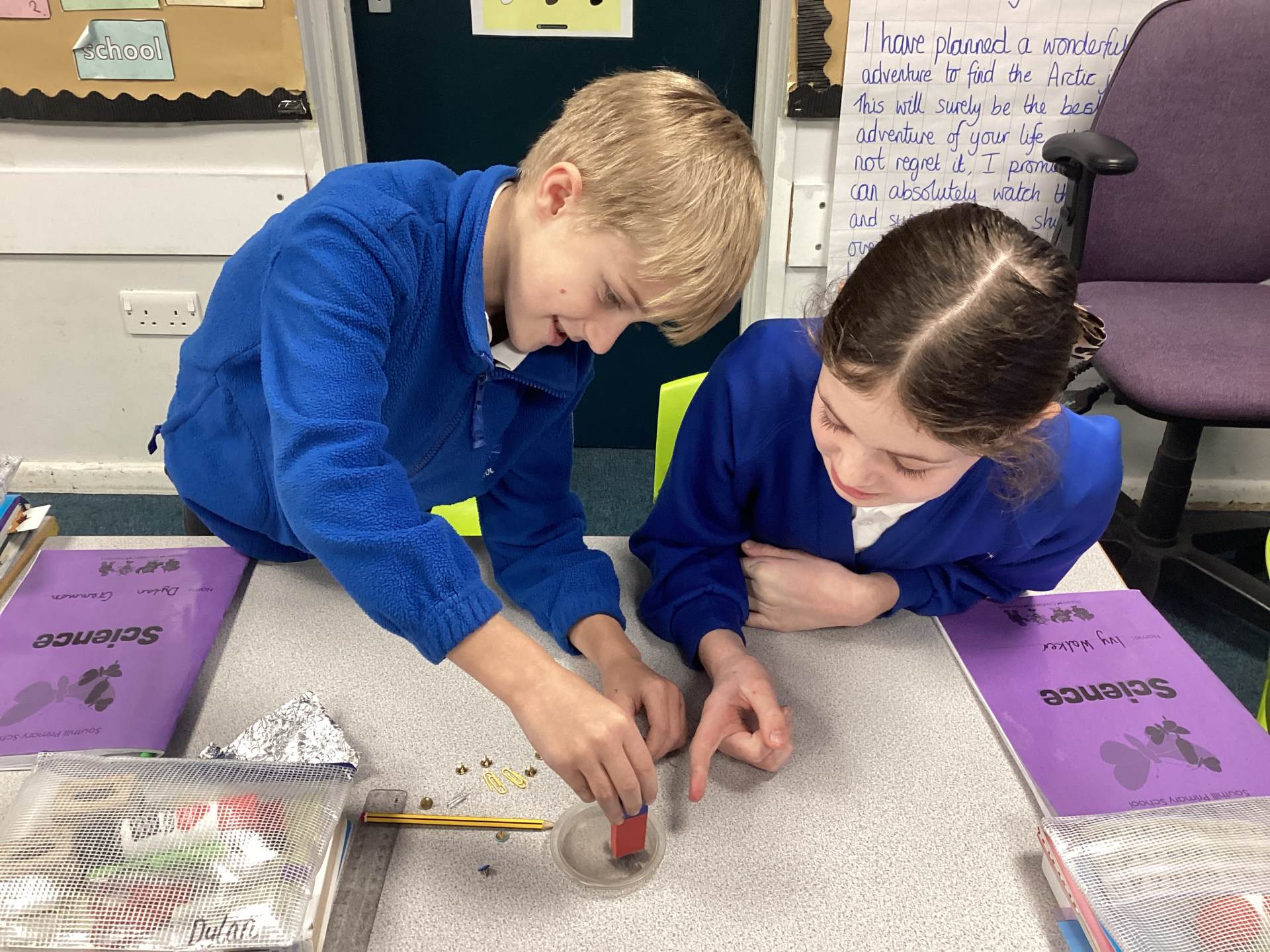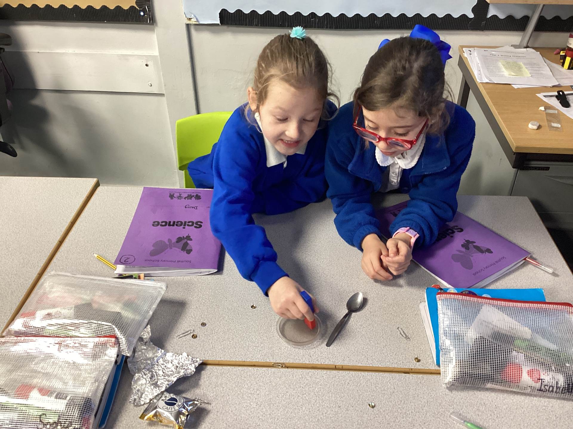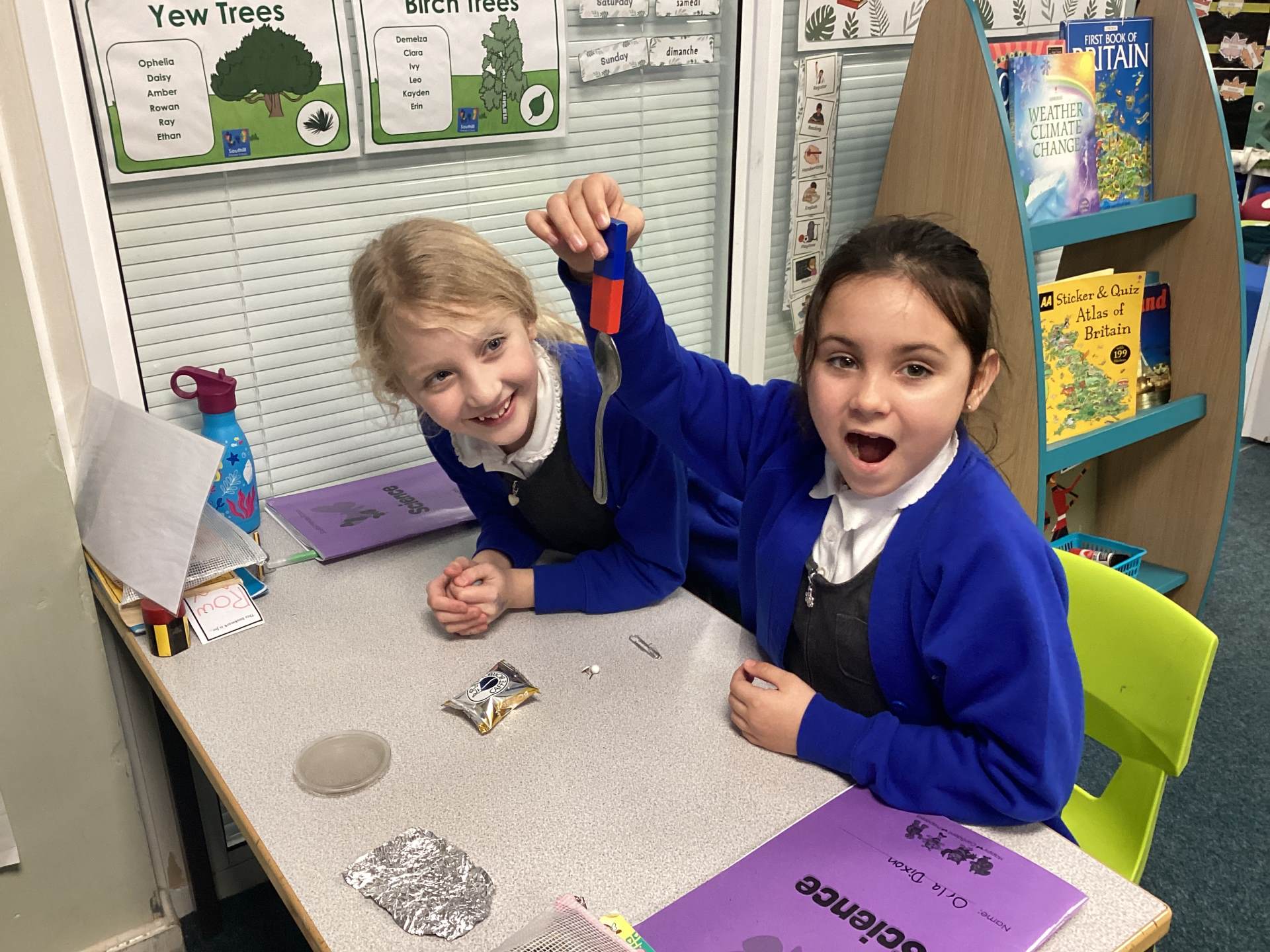 Continuing with our Science unit, Forces and Magnets, the children explored different metals and metallic objects to see if they were magnetic or non-magnetic. Before having a magnet, the children were given a variety of materials to handle and were asked to make a prediction as to whether it would be magnetic or non-magnetic. There was lots of discussion and reasoning and once all children had made their predictions magnets were handed out. The children really enjoyed feeling the 'pull' of the magnet and watching the magnetic objects move towards to magnet. One group tricked me into thinking that aluminium foil was magnetic, by wrapping magnetic objects up in it!