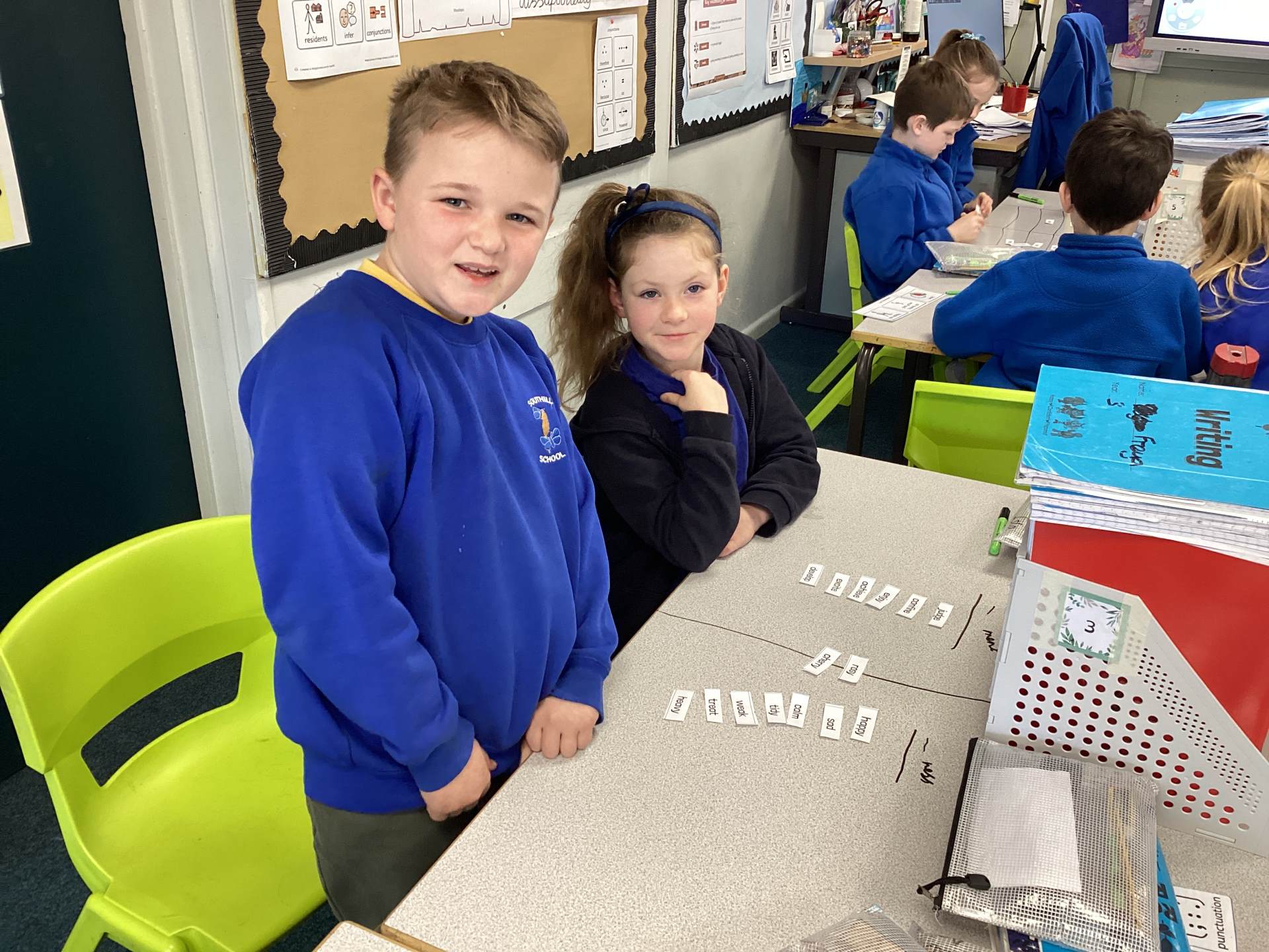 This week the children in year 3 were learning about the suffixes -ness and -ment. They had to work as a team to decide where root words would go in a table that they had drawn on the table! There was some great discussion and deliberation and just to make them work that bit harder, I told them there was a word within their pile that couldn't go into either side of the suffix table!