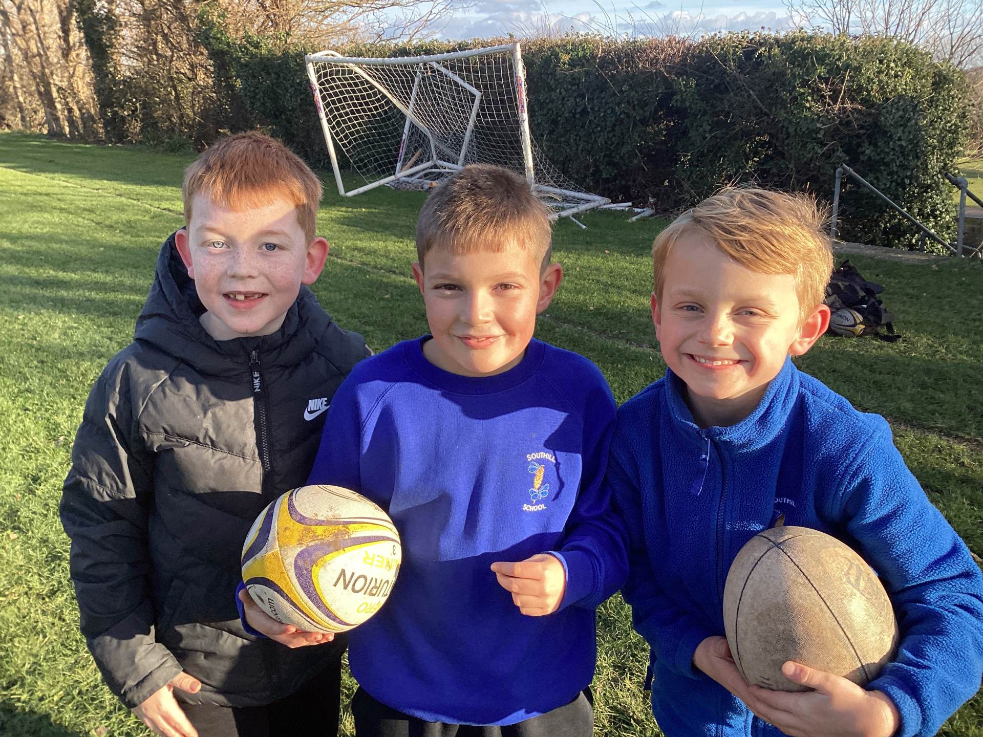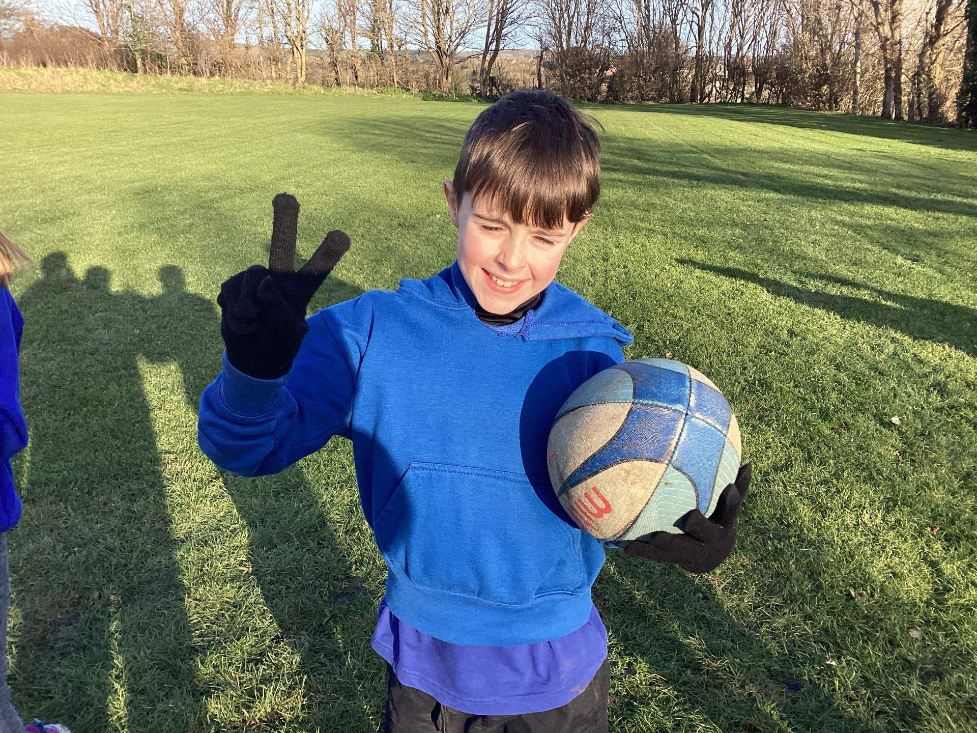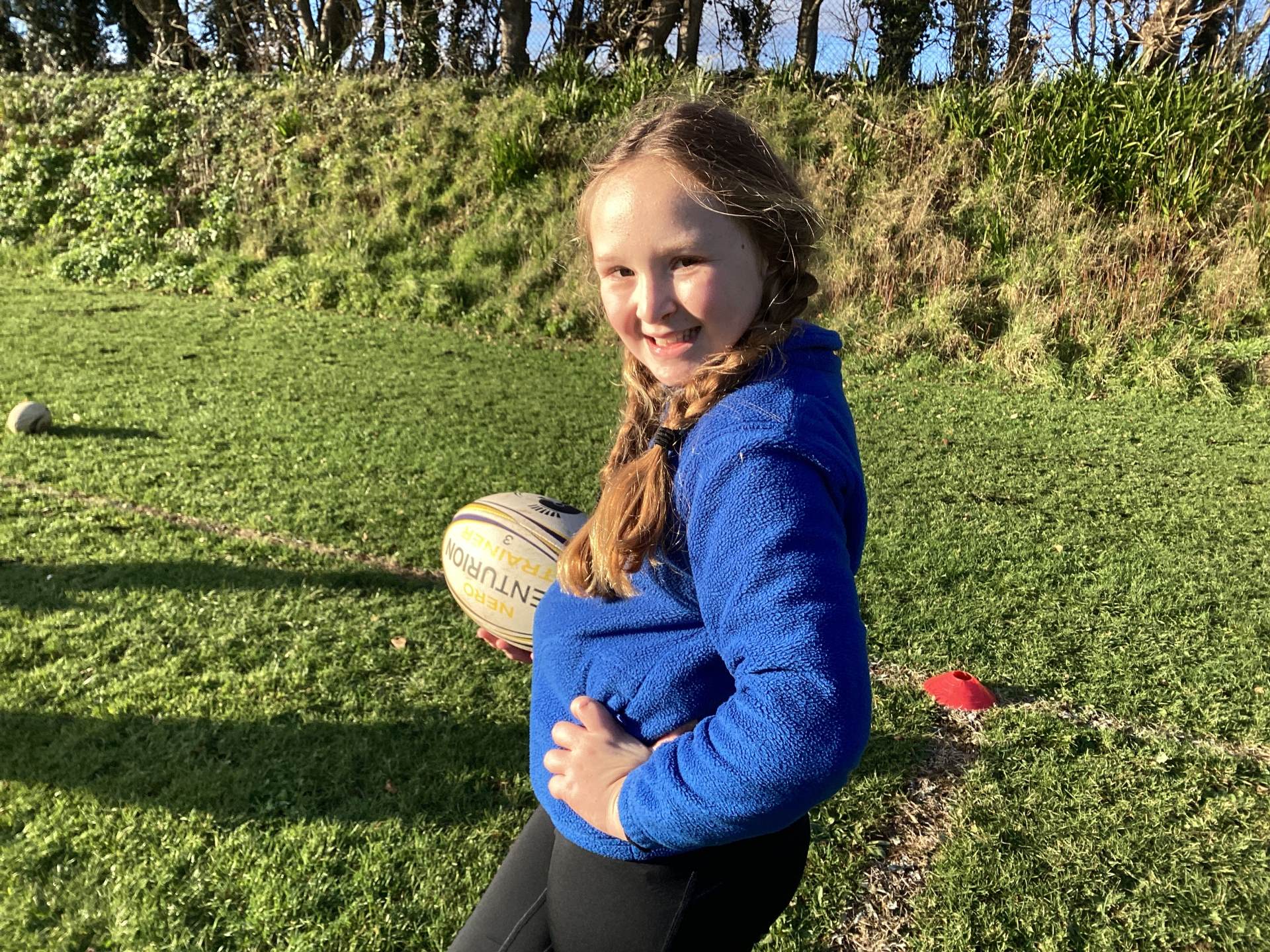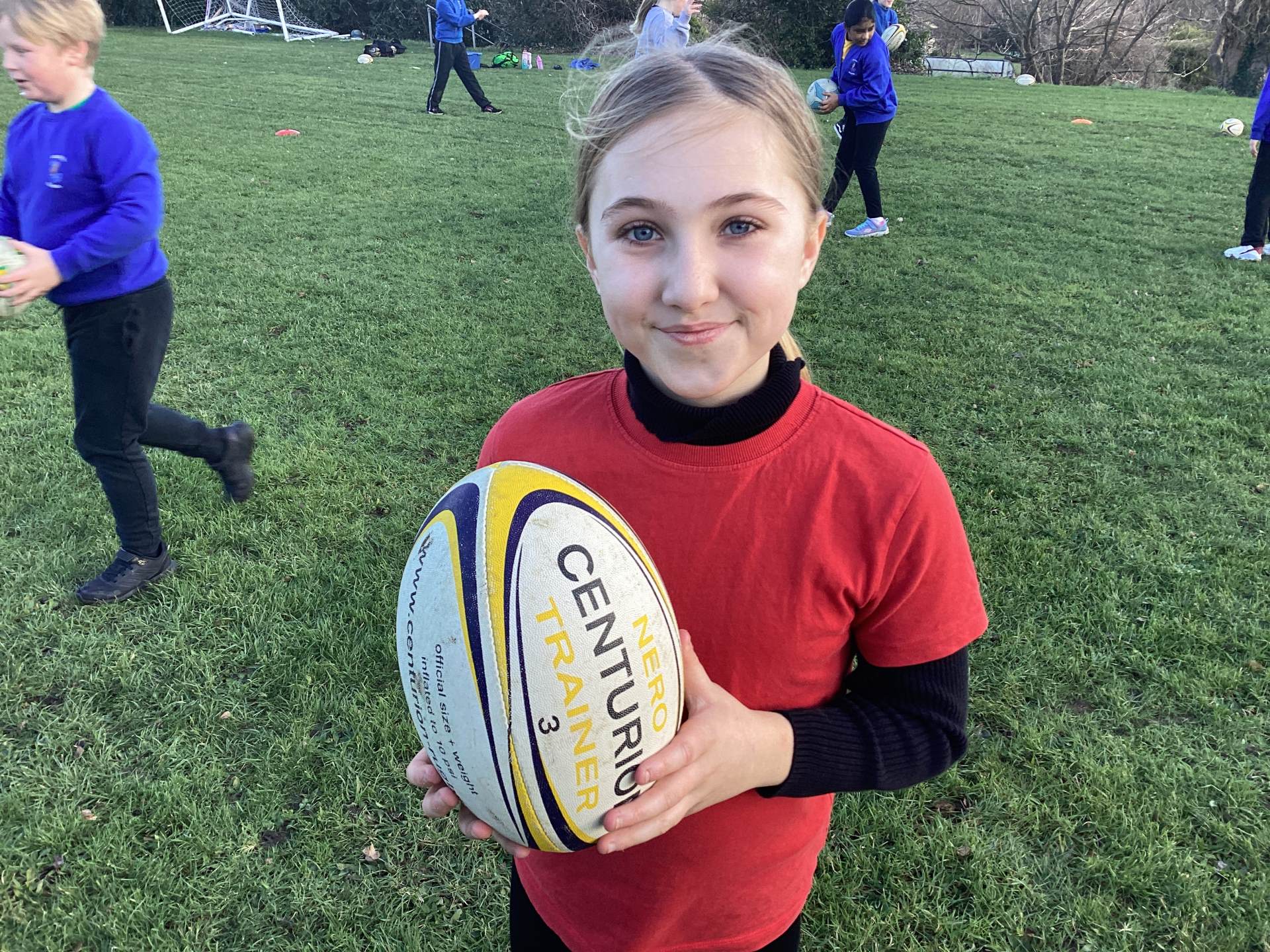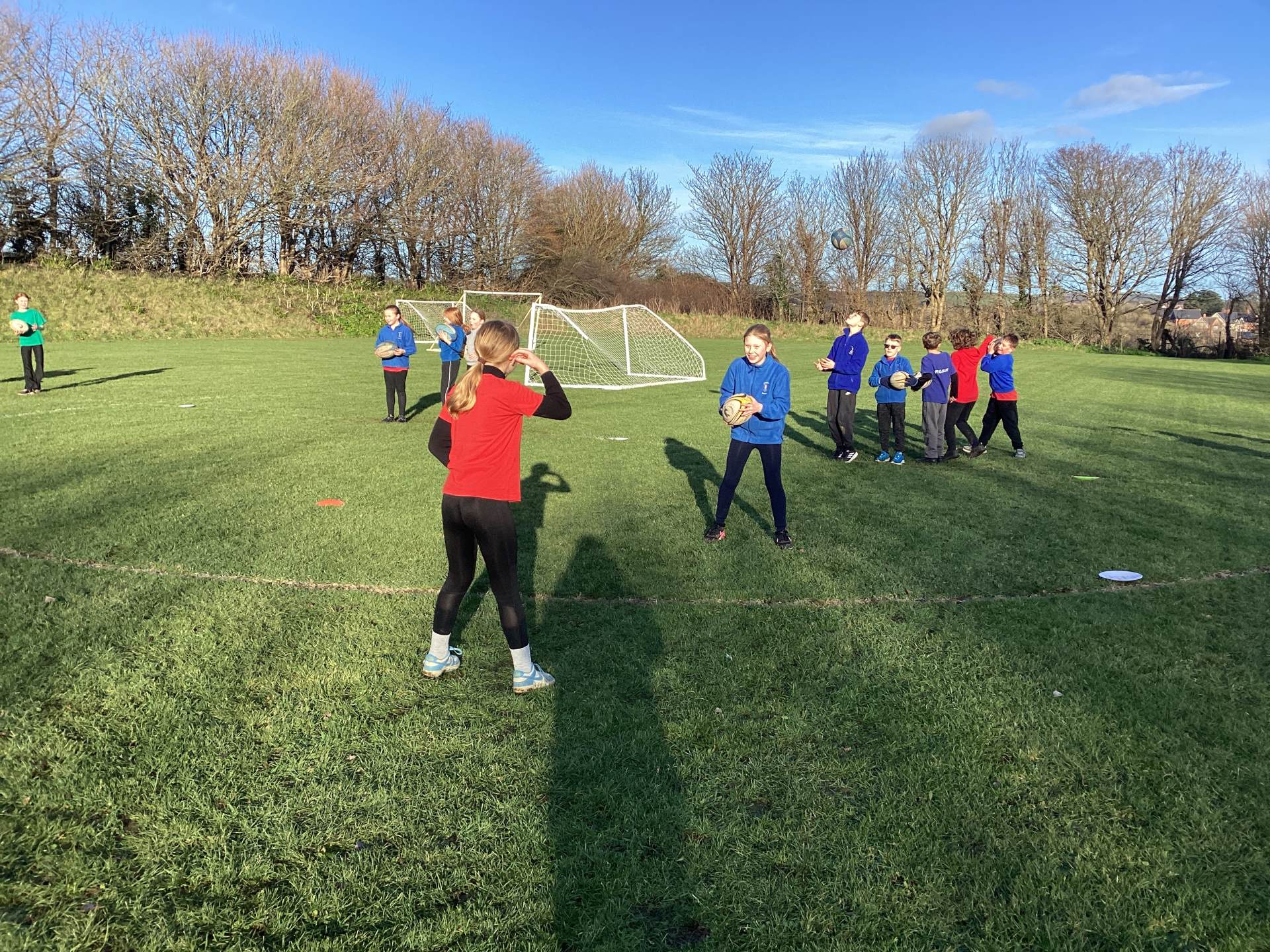 We began by getting to know the rugby ball. The children quickly noticed its unusual shape and learned that keeping it off the ground is very important. During the warm up the children ran around the area, scoring a try when “try” was called and throwing the ball into the air and catching it when “up” was shouted.