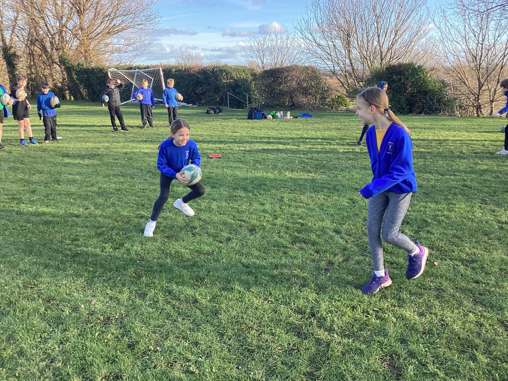 Next, we focused on the correct passing technique. Working in pairs and threes, the children practised their “rowing the boat” action, stepping forward and aiming for their partner’s chest. They then put this into action by running forward and passing back to their partner all the way up to the try line. It was a little confusing at first but they soon got the hang of it and absolutely smashed it.
