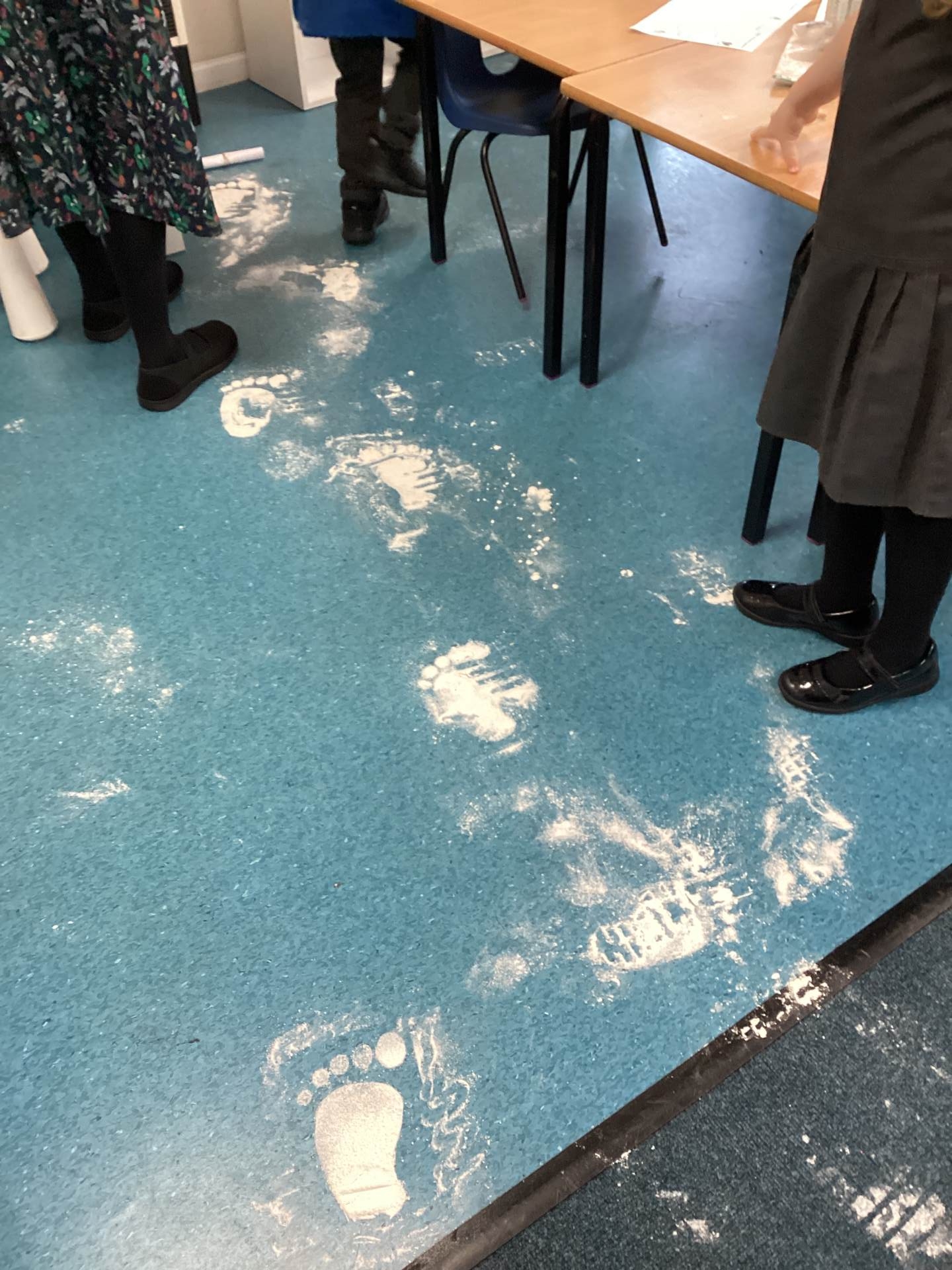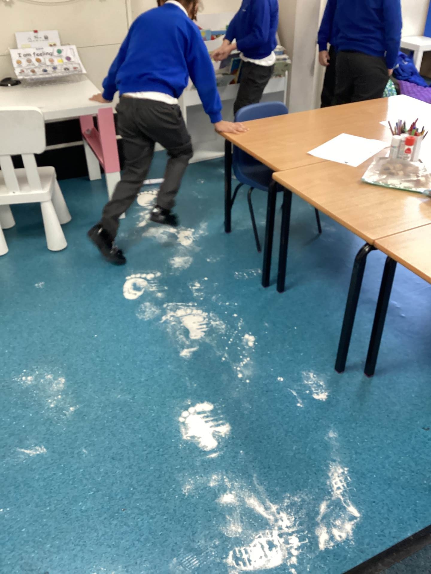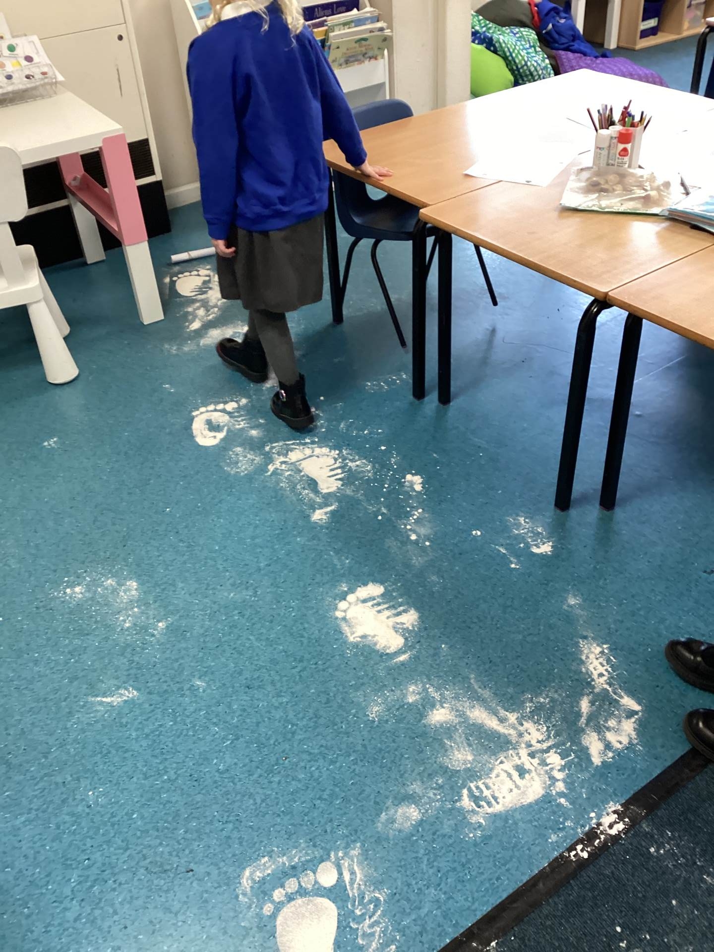 As the children walked into the classroom, they stopped in their tracks. Stretching across the classroom were huge, white footprints. They were much bigger than any grown-up’s shoes and looked very mysterious indeed!
