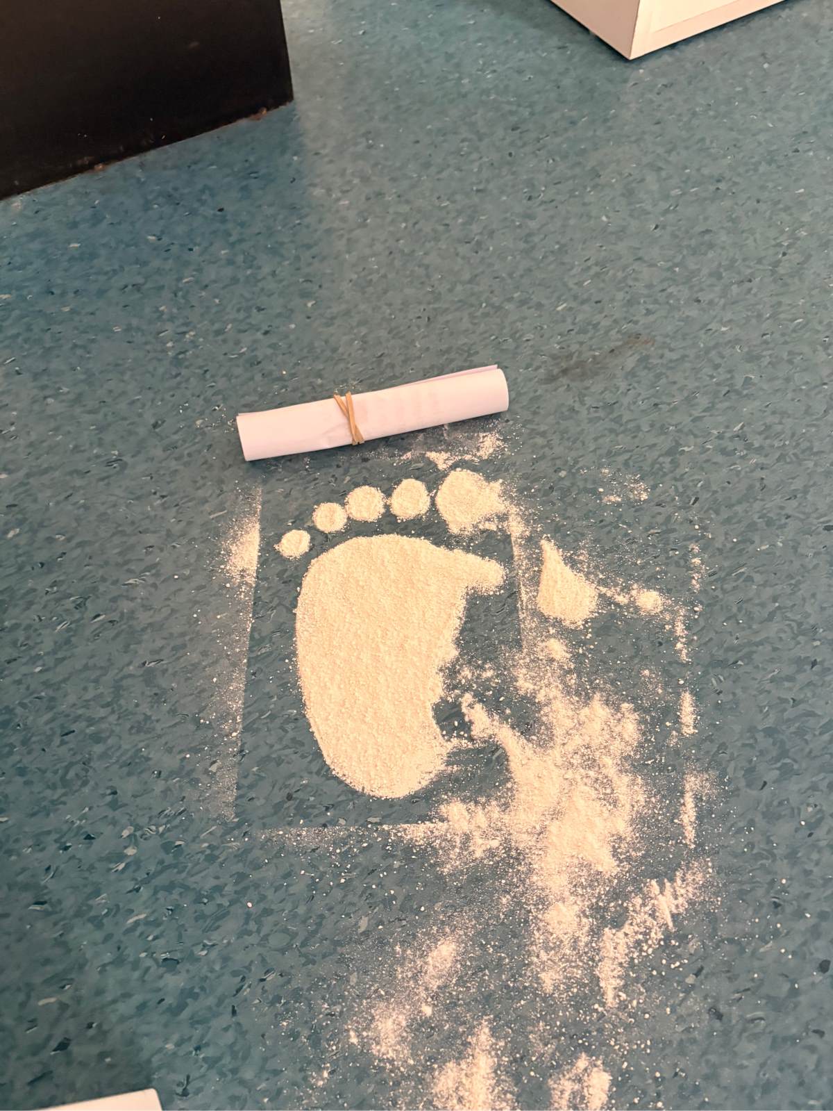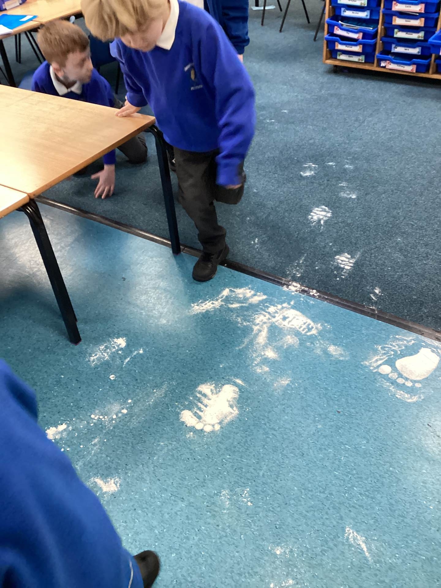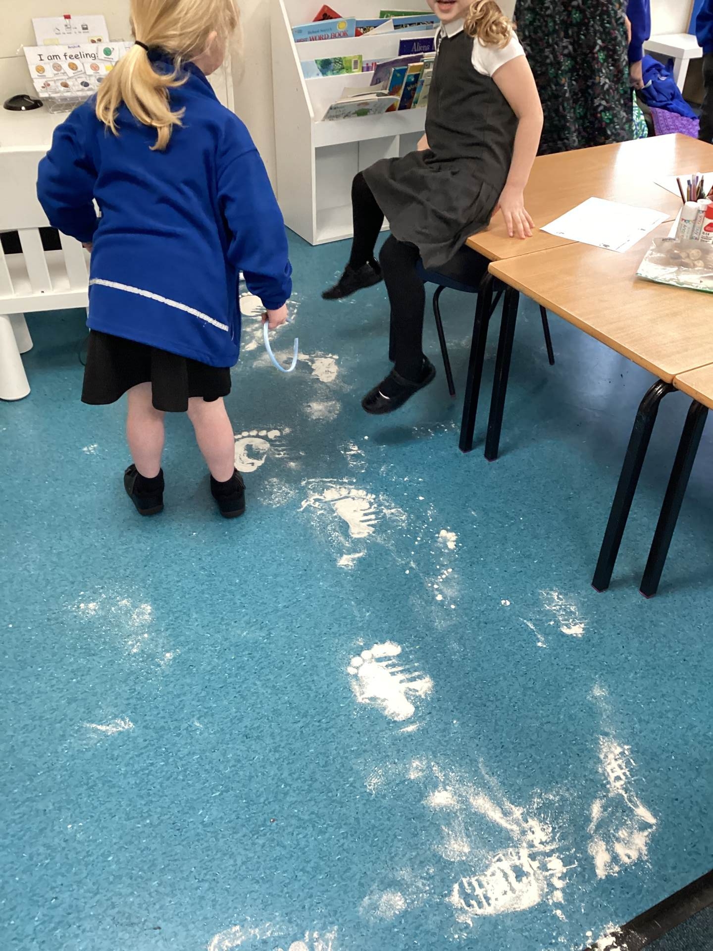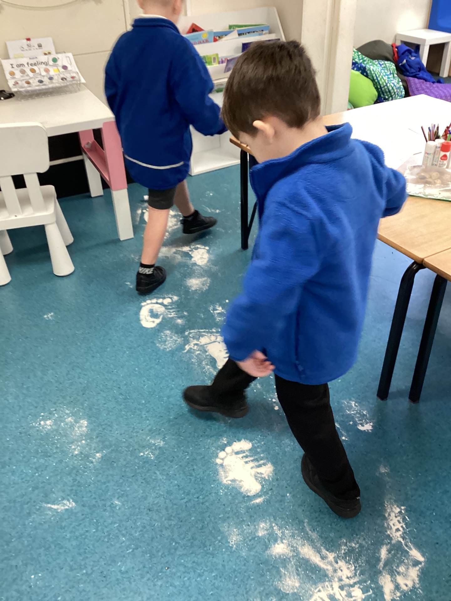 As the children walked into the classroom, they stopped in their tracks. Stretching across the classroom were huge, white footprints. They were much bigger than any grown-up’s shoes and looked very mysterious indeed!